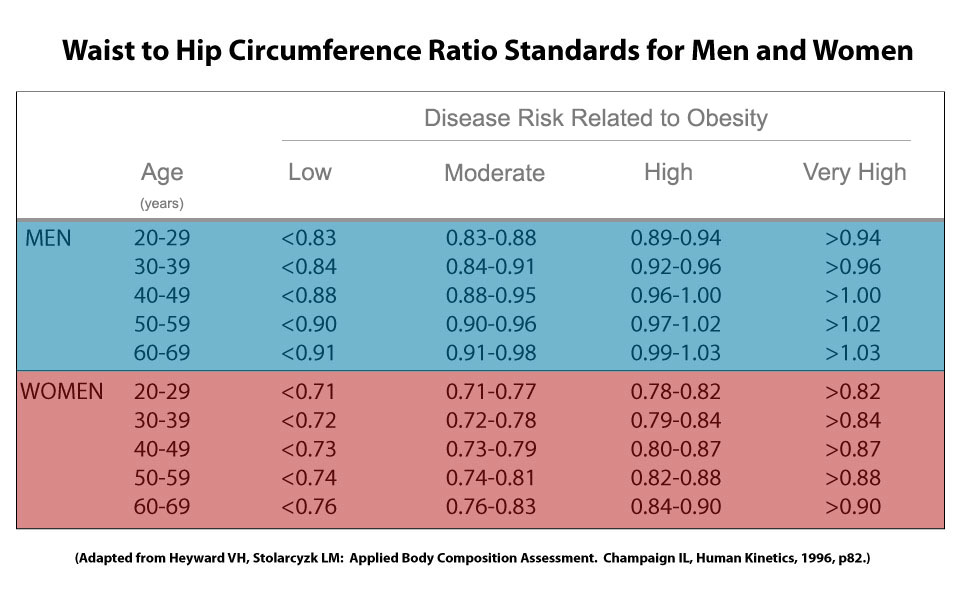 The waist to hip ratio measurement is calculated by dividing your waist circumference by your hip circumference and is helpful in identifying abdominal fat levels. High abdominal fat levels are associated with a high risk for diseases such as hypertension, type II diabetes, and cardiovascular disease. Enter below your current waist and hip measurements in inches. Then use the "standards chart" on the right hand side of the screen to determine the appropriate waist to hip ratio level for your age and gender range that would put you at low risk. Enter this number in the Waist to Hip Goal box to see what your waist goal should be. This calculated waist goal assumes that you lose no girth around your hips.